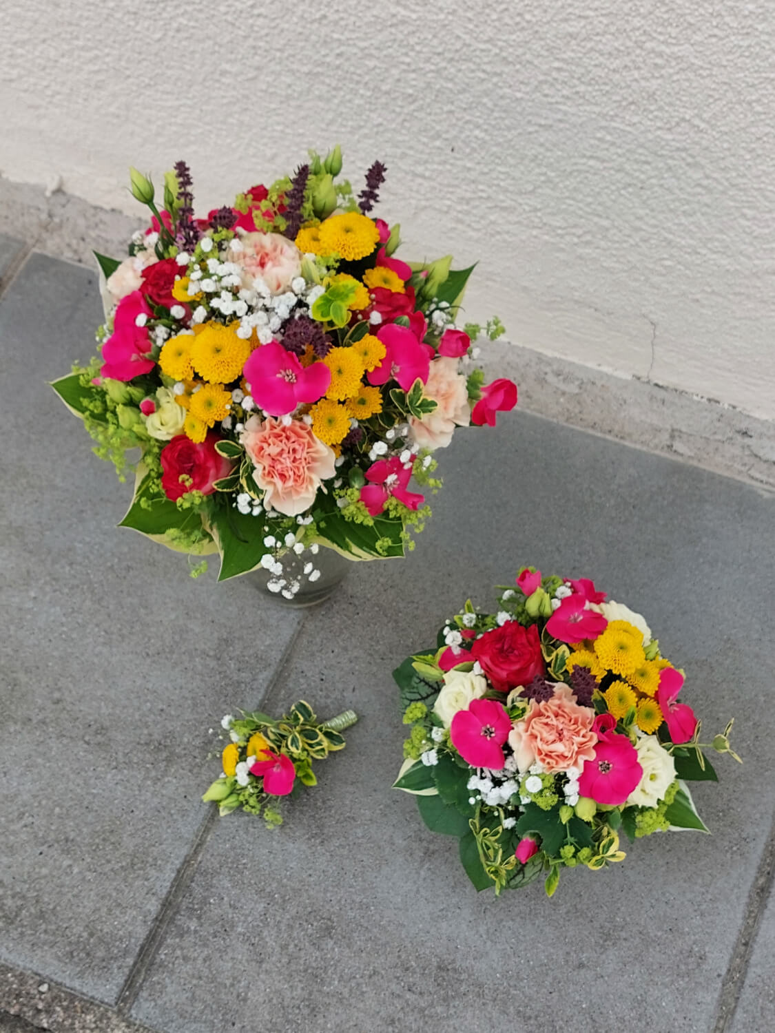 Brautstrauß, Wurfstrauß, Sträuße für Brautjungfern, Anstecker für Bräutigam, Trauzeugen und Gäste